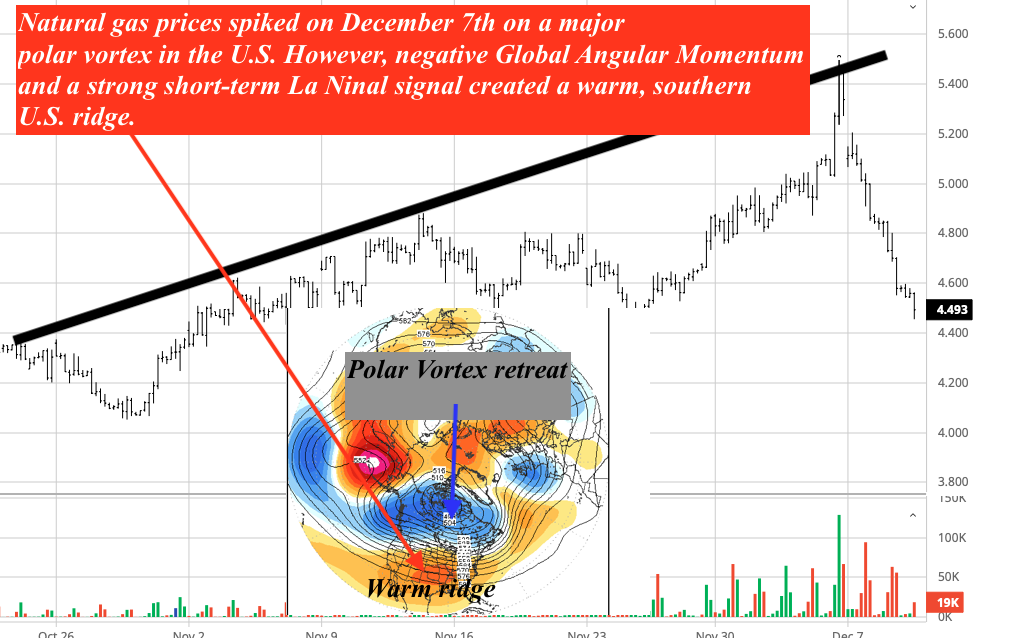 There are both positive and negative angular momentum phenomena, and it is the negative GLAAM that is responsible for the mid-late December warm up over most of the United States and (as of this writing) the massive 20% sell-off in natural gas in just a few days.