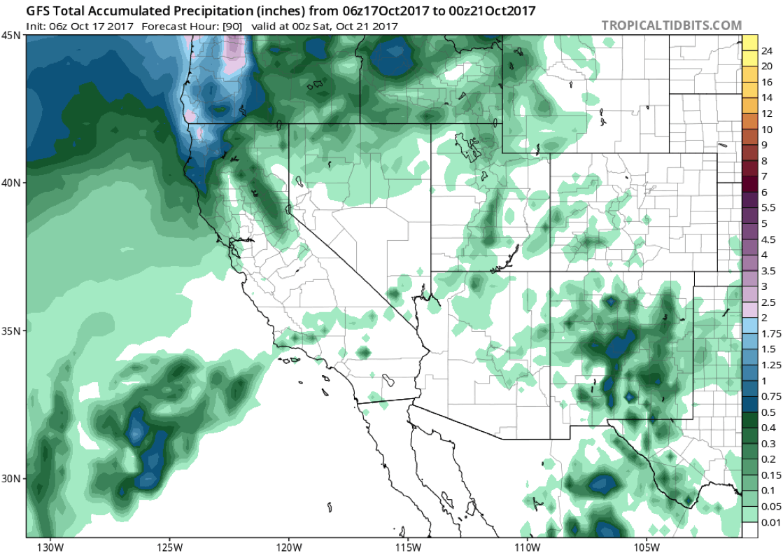 Winds have died down and the fires are becoming more contained. Luckily, rain is in the forecast, too. A cold front will com through overnight on Thursday. The latest GFS forecasts 0.1″-0.15″ of rain. After this brief respite, a ridge will build back in early next week.