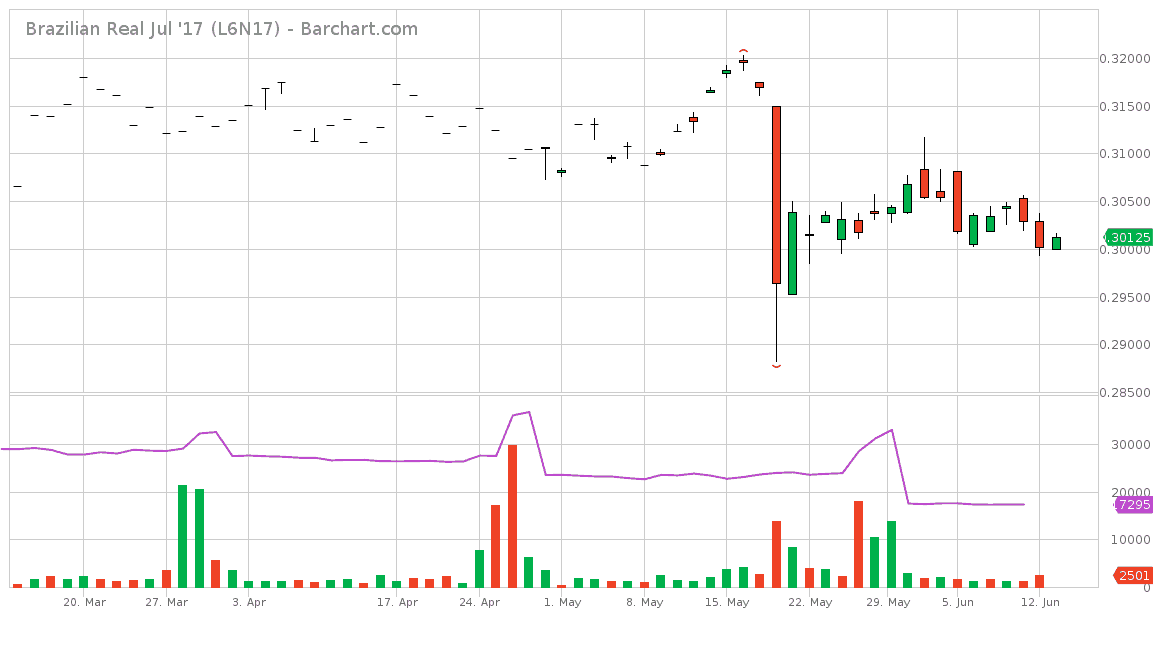Another reason why coffee continues to fall is the Real, Brazil’s currency. As the U.S. dollar strengthens over the real, U.S. coffee futures can wain in price. In mid-May, a corruption scandal involving Brazil’s president, Michel Temer, was revealed (see price drop below). The Brazil Real crashed as the possibility of a second presidential impeachment in as many years grew. Though no impeachment is imminent, his approval ratings are currently in the single digits. These events and Brazil’s current economy do not provide confidence in a real recovery.