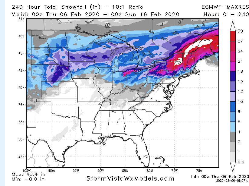 Areas in white show the potential for up to 3 feet of snow in New England the next 10 days. Even central New England will see at least a foot or two improving ski conditions.