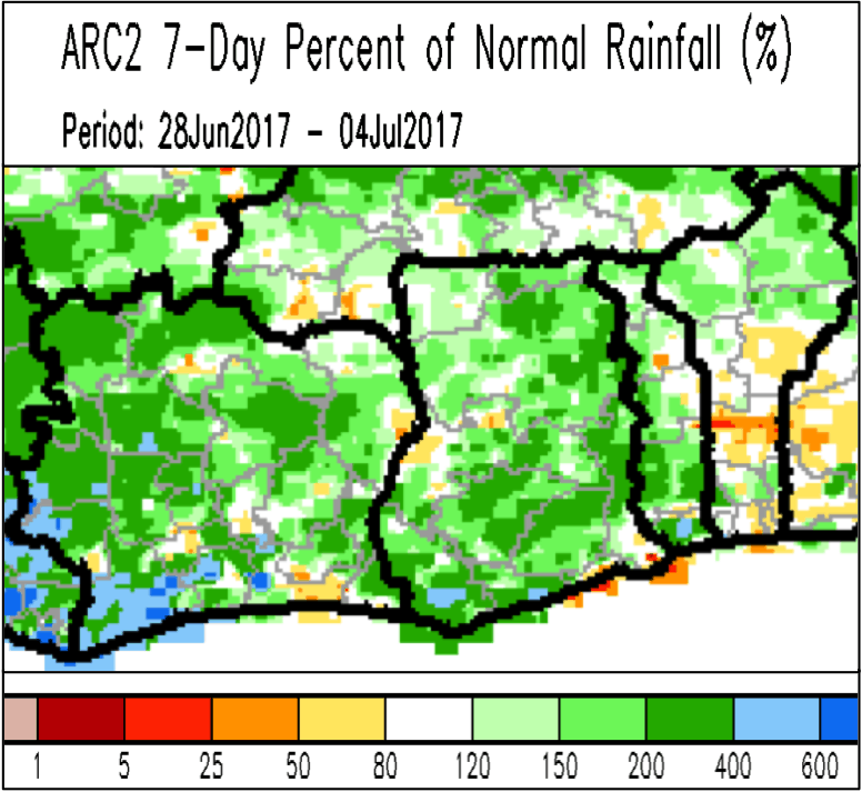 Rainfall has been well above normal the past few weeks. Some news reports mention concerns about it affecting the the harvest and sale of the mid-crop (May-Aug). The roads have been impassible at times. Another worry is black-pod disease caused by a fungus. Too much rain provides better conditions for the disease to occur and spread. June had above normal rainfall, with the past week being particularly wet (+200%-600% of typical rainfall in spots).