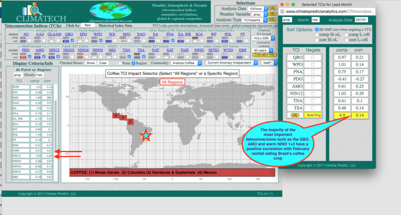 Teleconnections (below), such as the warm Atlantic (+AMO) and warming off the coast of Peru (Nino 1+2), suggests the atmosphere is acting less like a La Nina. Though a bit hard to read, the graphic below of our exclusive long range weather forecast program for commodities, Climatech, illustrates the positive correlation (wet) for NE Brazil going into mid February