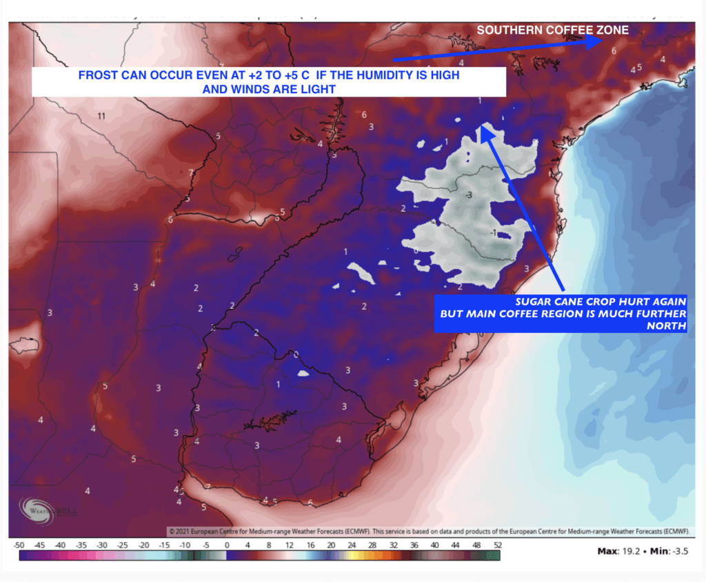 - COFFEE FROST FOR BRAZIL: WOULD HAVE BEEN A BIG DEAL 25-40 YEARS AGO BUT TOO FAR SOUTH OF MAIN COFFEE ZONE