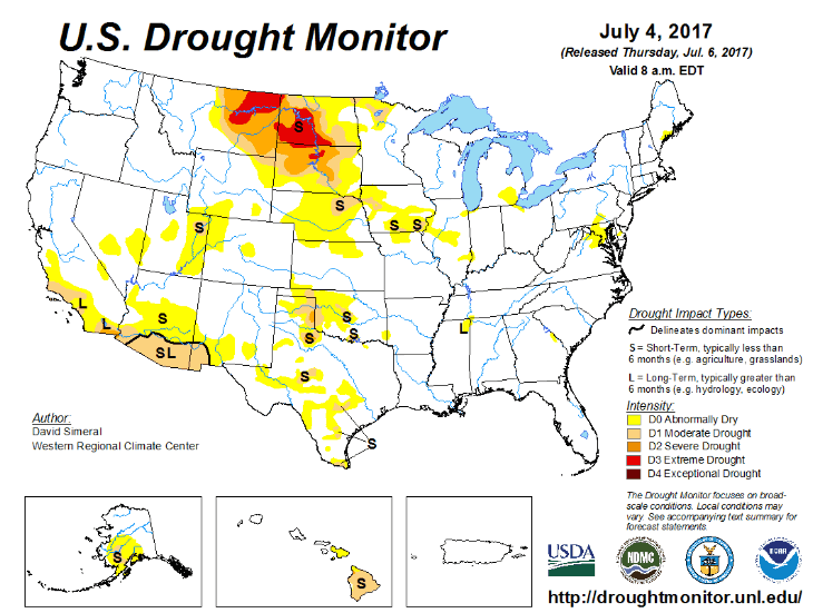 The main cause of concern is the drought spreading from just North and South Dakota (12% of soybean production) to Iowa (17%) and Illinois (18%) as well. The latest drought monitor indicates a slight drought in Iowa, parts of Minnesota, and parts of Illinois.