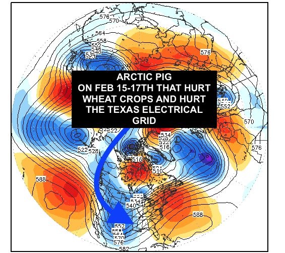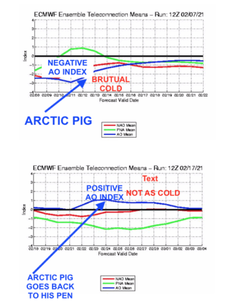 Shown above is how the AO index was negative this past week (Arctic Pig) causing major snowstorms, power outages, spikes in energy, and wheat prices. The lower map shows the Arctic Pig heading back north next week.