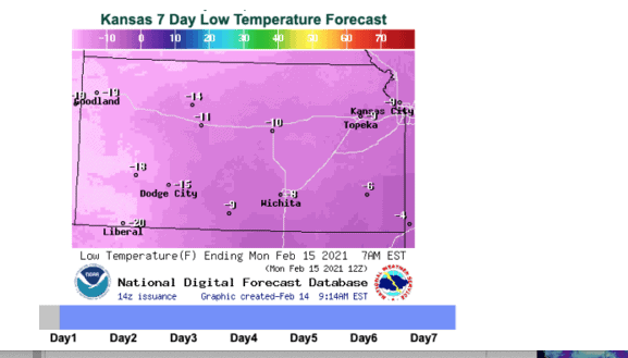 Look at some of these temperatures in Kansas on February 15th. While wheat crops often have 9 lives, the lack of snow cover and drought could cause further concern in the months ahead. But it may not be till spring that more of a concern in the wheat market is realized. If spring is wet, this would off-set the frost damage.