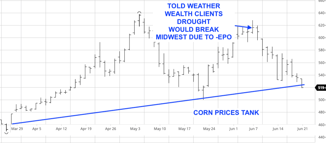 I called these drought easing rains 2 weeks ago, which have resulted in a crash in grain prices. However, it is still a long summer and the spring wheat drought is growing
