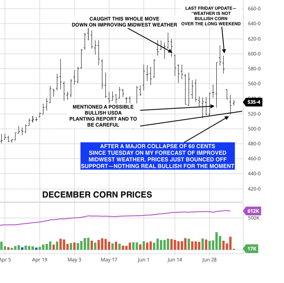 3. How I predicted the collapse in corn prices (price chart as of 7/8/21) for clients. However, there is going to be some concern from wet weather for some other crops.