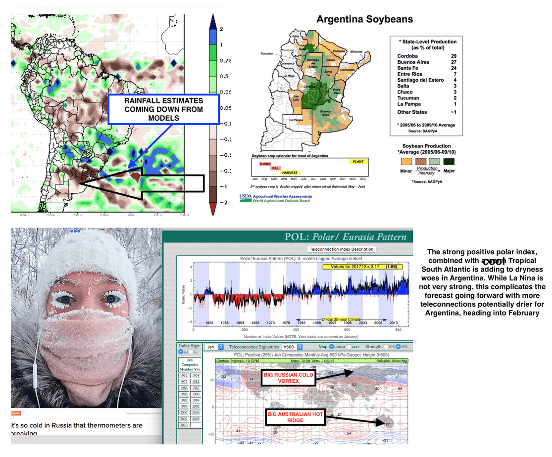 There have also been some global weather for grains in both the northern and southern hemispheres. Dry and hot conditions struck Argentina beginning in December. The lack of relief has begun to worry traders, who were initially expecting a decent crop. South Africa has been suffering from dry weather as well, impacting corn crop conditions. See the POL index we’ve talked about before. A strong signal of dryness in these areas is present. There are indications that the corn crop in Argentina will be hit the worst, with a significant decrease in yields possible.