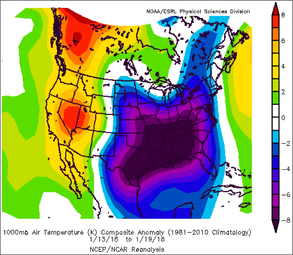 Swings in the weather forecasts have caused equally volatile natural gas futures. It was so cold in Alberta earlier in January that natural gas wells froze up! Last week, frigid air and winter storm blasted the southern United States. See the cold week in the temperature anomalies below: