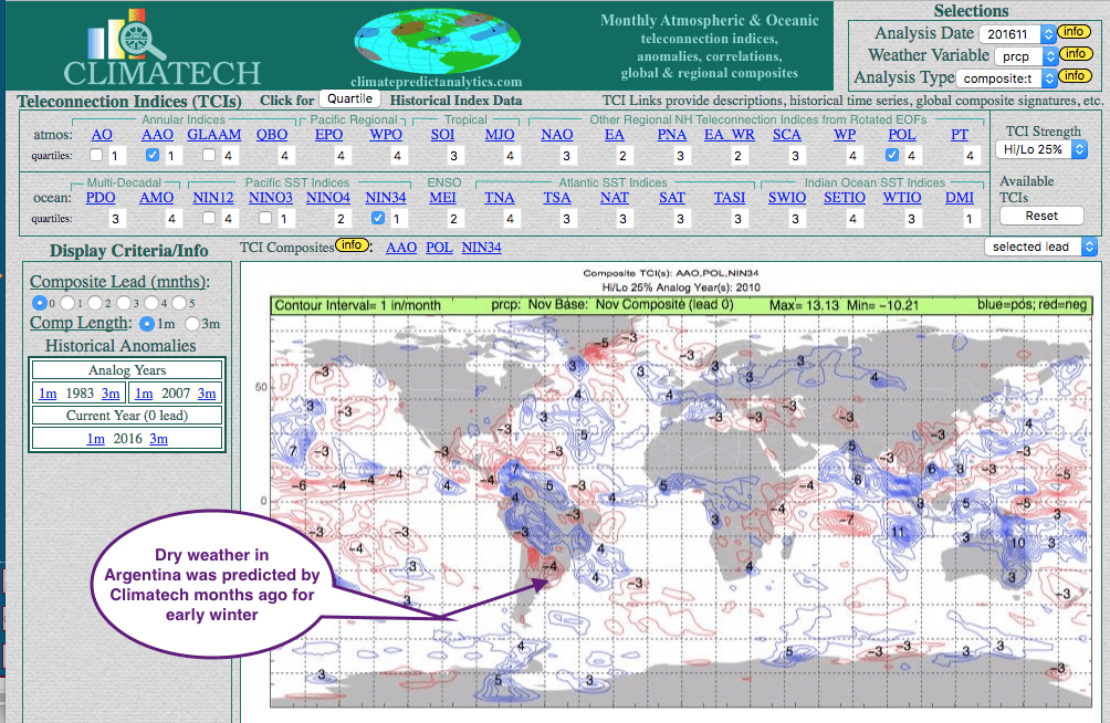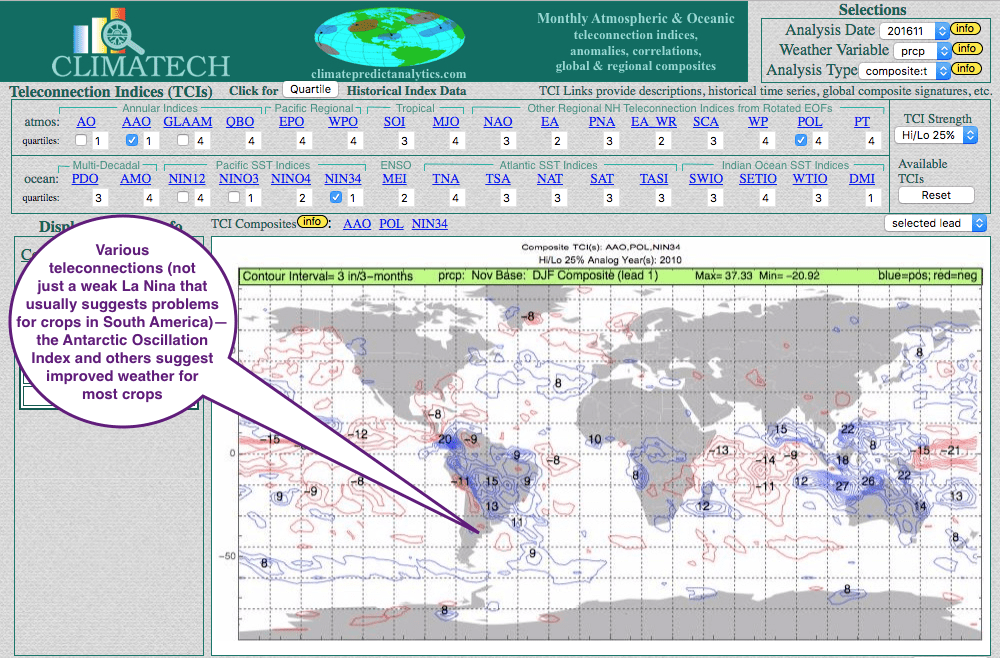 Our CLIMATECH program shows the projected Dec-Feb rainfall patterns for South America. Of importance is also the Antarctic Oscillation Index. This is similar to the Polar Vortex in the northern Hemisphere that we sometimes talk about that can excite natural gas traders with extreme cold in the U.S.