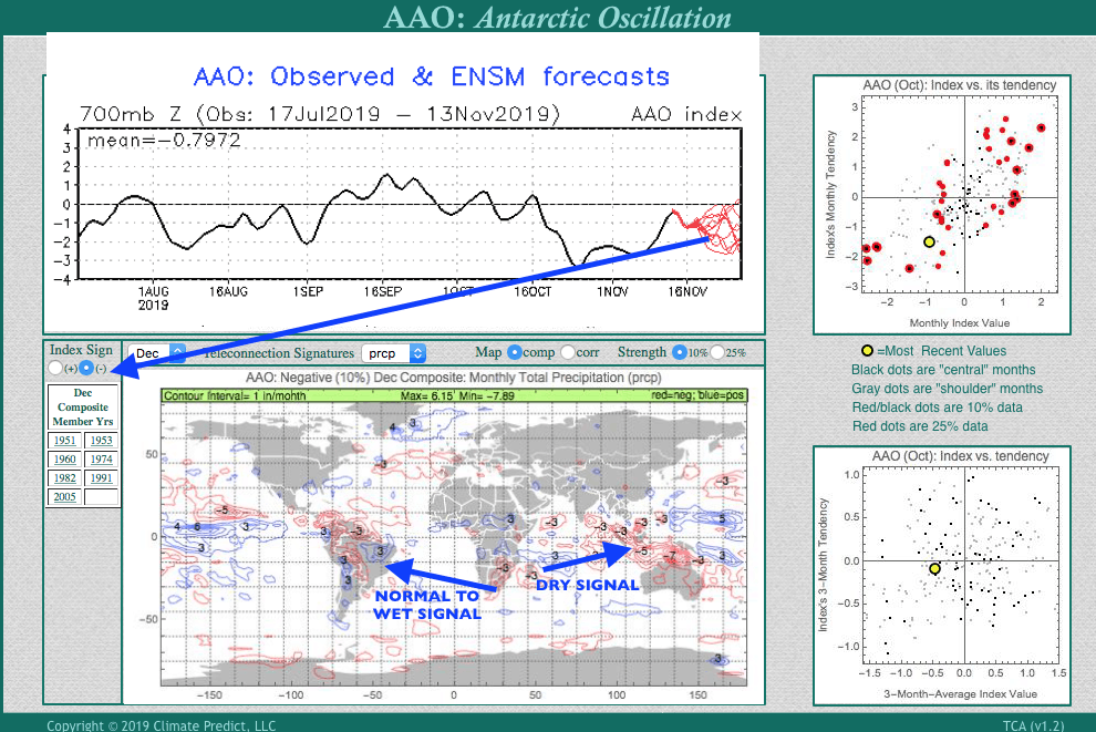 The major warming occurring some 30-50 miles up in the Atmosphere is one key teleconnection influencing global weather. This has forced the AAO index to go negative. The map at the top of the page shows (blue–above normal rainfall) in key Brazil soybean and coffee areas when this index is negative.