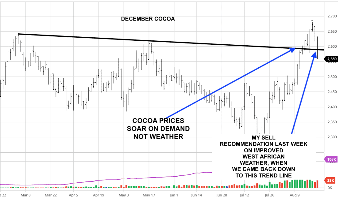CONCLUSION COCOA: I mentioned last week that if December cocoa prices come back down to the trend-line to short this market. It did early Friday. I am bearish on the weather and would not risk a stop above last week’s high, shown on the charts. What will cocoa prices do deeper into the fall and winter? Stay tuned for my winter forecasts for La Nina Modoki and some ideas.