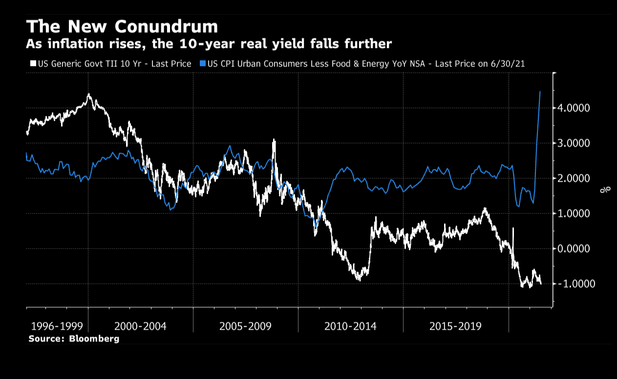The conundrum is most pressing if we look at the yields on Treasury inflation-protected securities, or TIPS, whose ultimate payout at redemption is tied to inflation. People are prepared to buy them for a yield of -1%. The varying paths of core inflation and the 10-year TIPS yield look truly bizarre