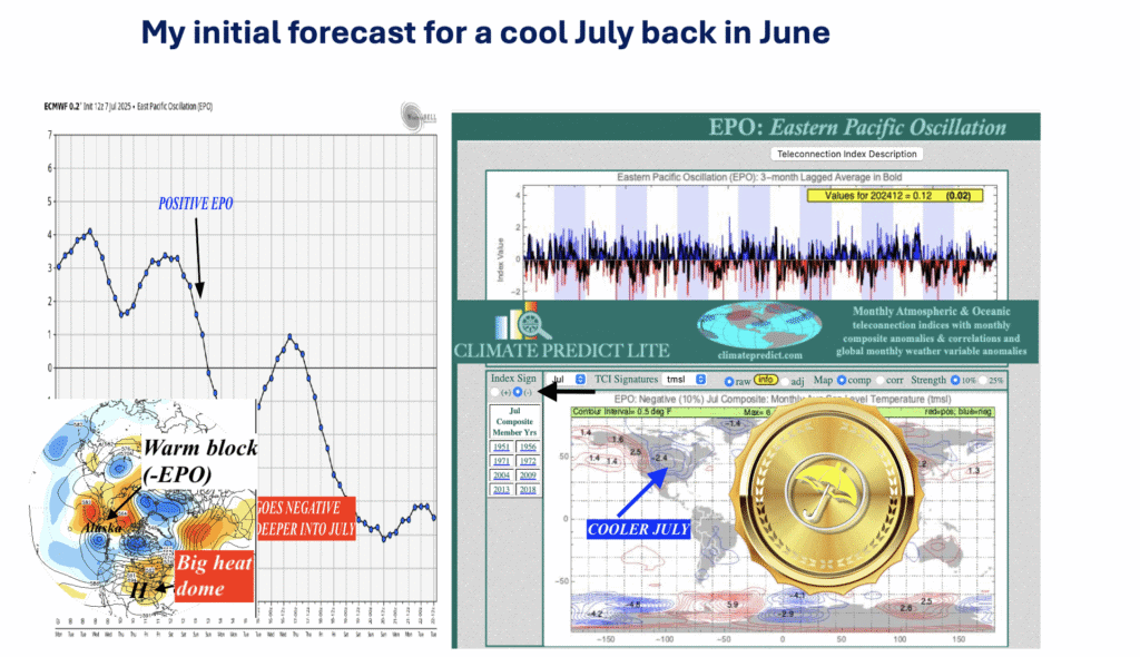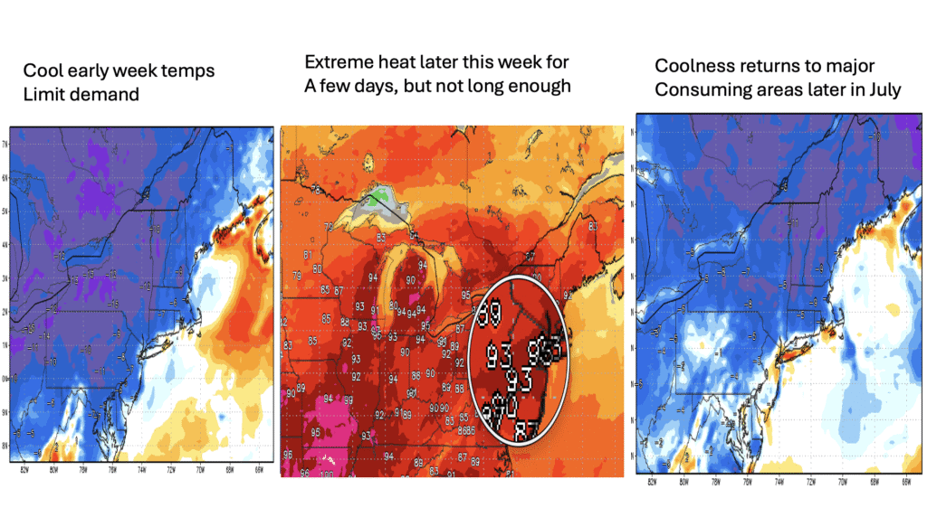 The map at the top of the report, depicting a negative Eastern Pacific Oscillation Index, is most important during the winter months for natural gas trading. The warm block near Alaska above 15,000 feet can send the Polar Vortex south, thus exciting energy traders. However, in the case of summer weather, its influence can vary depending on whether or not there is a La Niña and hot southern U.S. ridge to deflect its cooling influence.