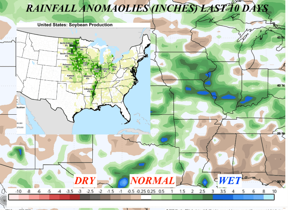 For soybeans, the market has rallied a bit on Trade Tariff hopes and some short-term extreme heat in the Southwest soybean belt, but it will not last. So… here too, no harm done.