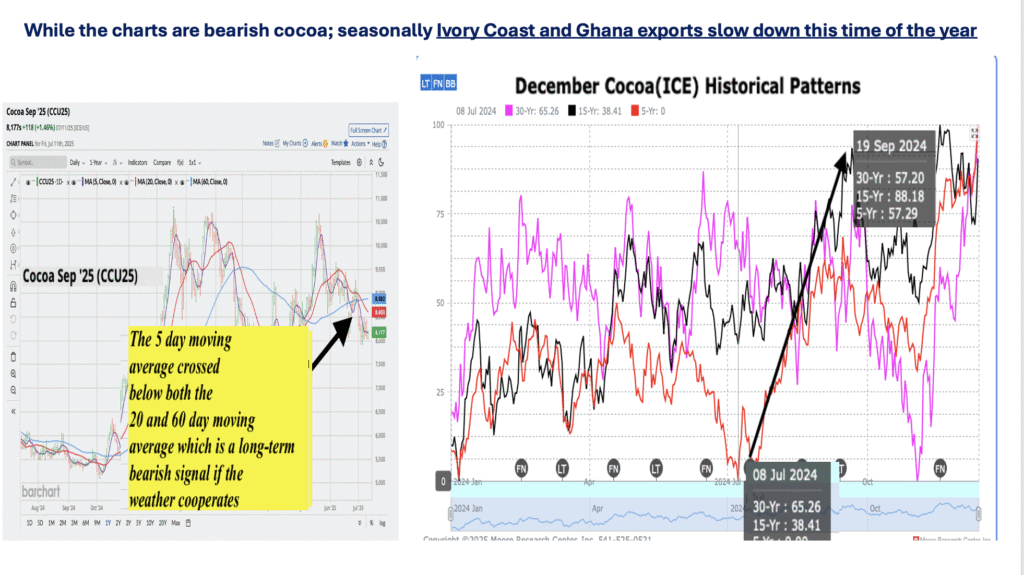 Long the March, 2026 $3.00-$2.50 coffee put option spread from more than a month ago and ahead over $2.000/contract. Potential profits could be over $4,000 if we have decent October-December weather for Brazil and prices fall below $2.40. I am not recommending short call options currently as I already had a “home run” a month ago selling $4.00-$4.50 calls for over $5,000/contract profit. Eventually, coffee prices should fall to $2.00-$2.30 if my long-range weather forecast is correct, later this year (no change in my comments 2-3 months ago).