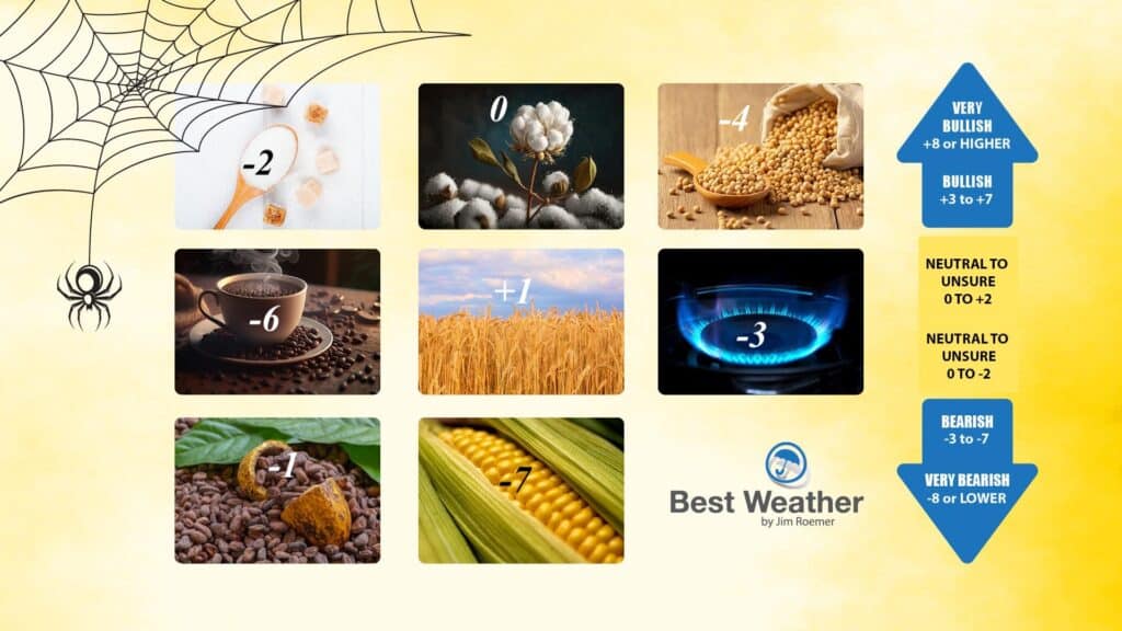 The BestWeather Spider has been all over the place for natural gas the last few weeks, so, please accept my apologies. It’s a shame, because two weeks ago my Spider was a very bearish (-8); but I got caught up in the short-term big US heat and strong LNG exports to Europe. Now, with cooler weather, there is very little chance for any more than a 10-20¢ rally the next week or two, at the most.