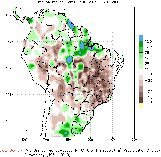 A recent BLOG I posted discussed the differential in prices between Arabica blends (traded in New York), and Robusta blends (grown in Vietnam, Indonesia and NE Brazil and traded in London). I have been bullish Robusta coffee for more than a year due to global weather issues. Now we can see some developing dryness in some key Arabica coffee areas. Though not a major concern right now, some research I have done suggest off and on dryness into February that may compromise just a bit the 2017 crop.