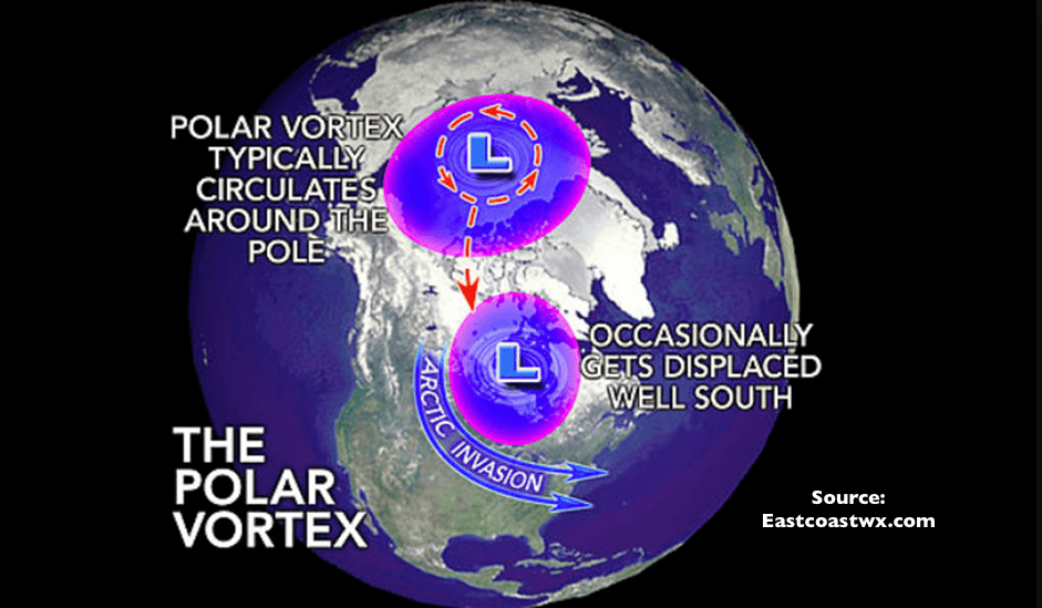 The map rotating below shows the influence on how a warming arctic (red) can displace the polar vortex (blue) across the United States and Europe. This particular image shows the severe winter in January 2010
