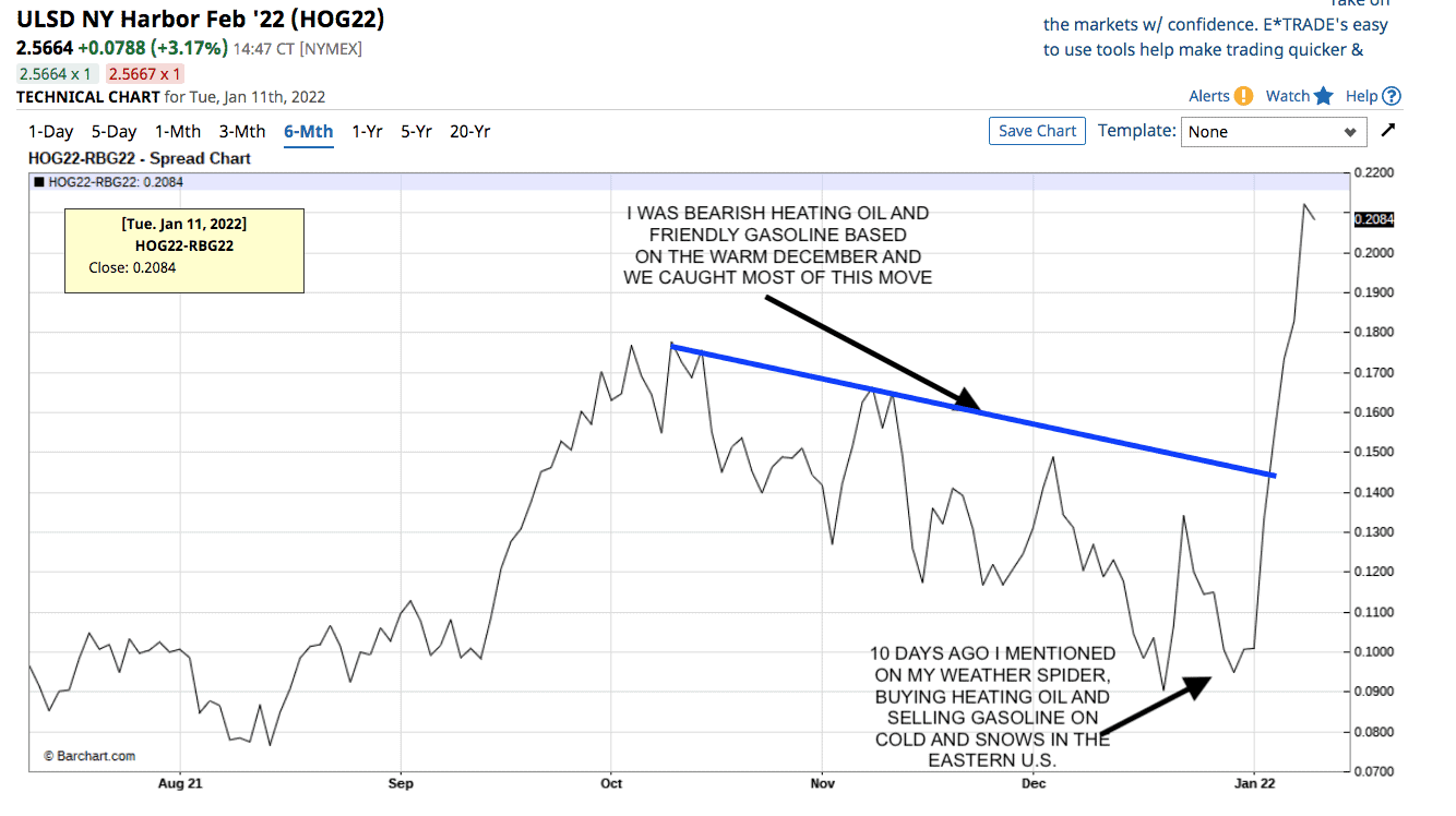 Other than natural gas prices soaring, following the December collapse, take a look of what heating oil prices have done vs gasoline. When we have consistent major cold with snows, this slows down driving and travel and hence heating oil prices tend to outperform gasoline. Want to learn how to trade the weather and get more timely weather forecasts. We invite you to a free trial here